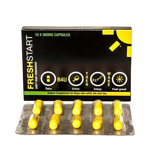 Designed to prevent unpleasant consequences of alcohol intake, these Fresh Start capsules come in 10-, 20- or 30-pack
