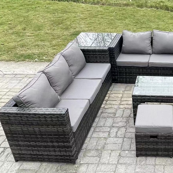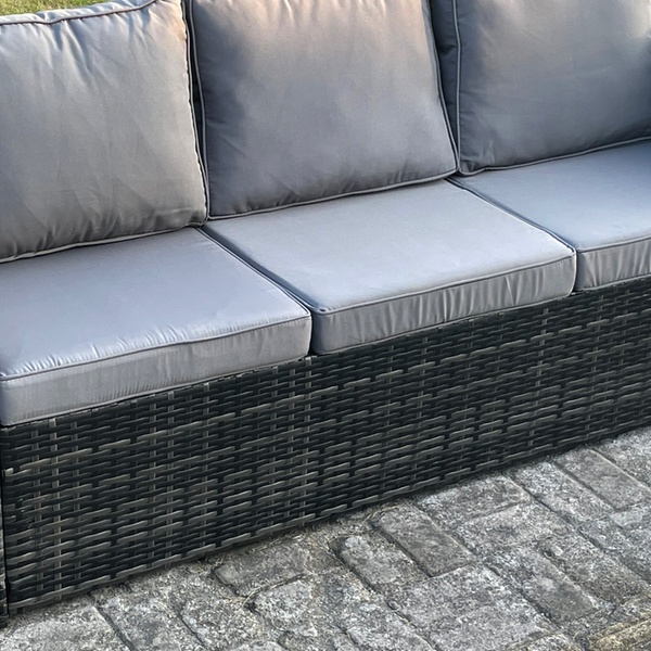 This classic sofa set can accommodate 10 peoples and has a comfortable and soft cushion back, made of dark grey PE rattan that may withstand British weather