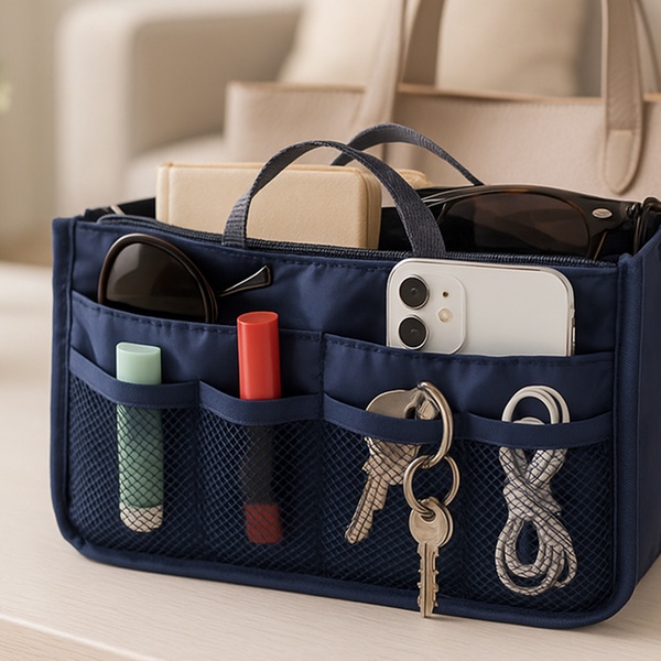 - Open the handbag organiser and insert the items into the various pockets