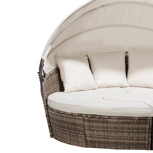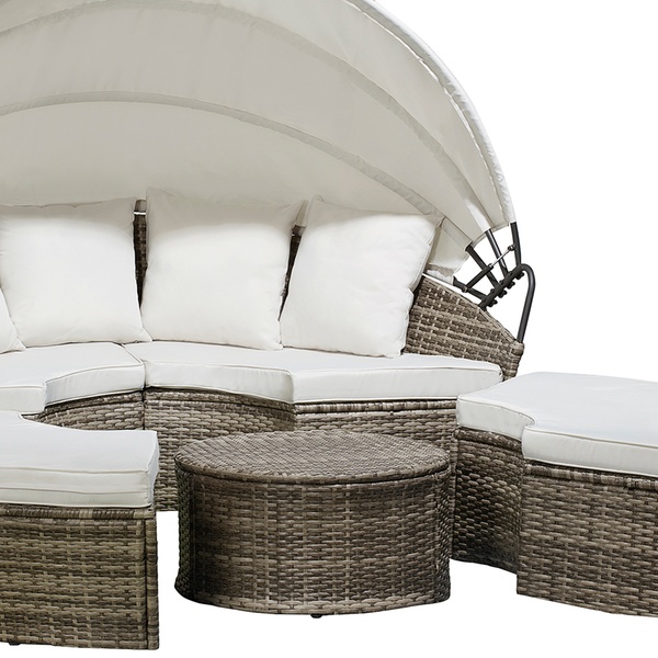 Set includes two stools, a sofa with a retractable canopy, and a central table