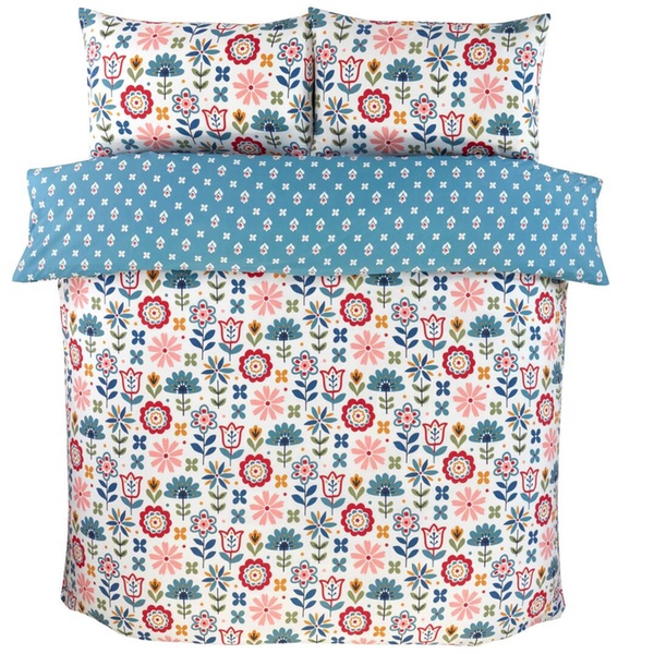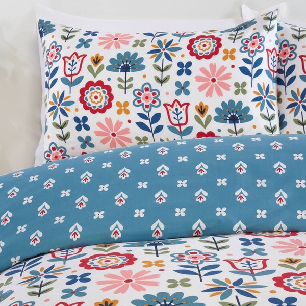 Brighten the bedroom with the charming Olivia Reversible Duvet Set; this bedding features a lively folk-inspired floral print in a joyful palette (pink, blue, red, orange) that reverses to a playful blue pattern for two looks in one