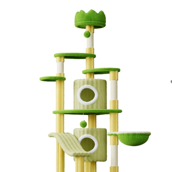This 7-layer indoor cat tree combines fun and comfort with plush surfaces and sisal-wrapped columns for playful climbing and scratching.