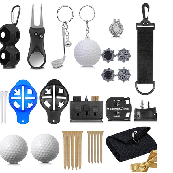 - Includes ball markers, tees, divot repair tools, cleaning brushes, towel clips, and more.