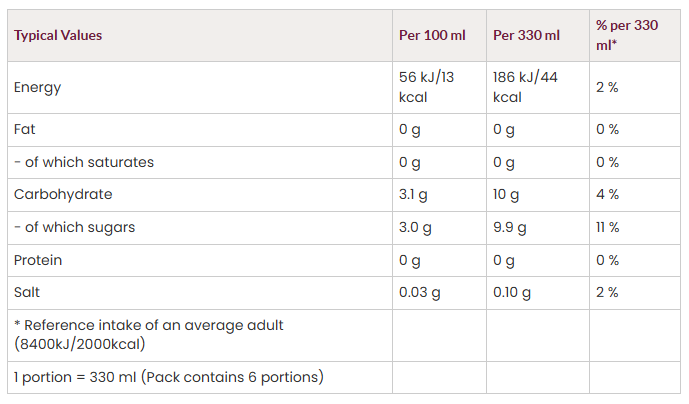 Dietary information: Low calorie, no artificial sweeteners, no preservatives, vegan, vegetarian