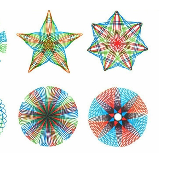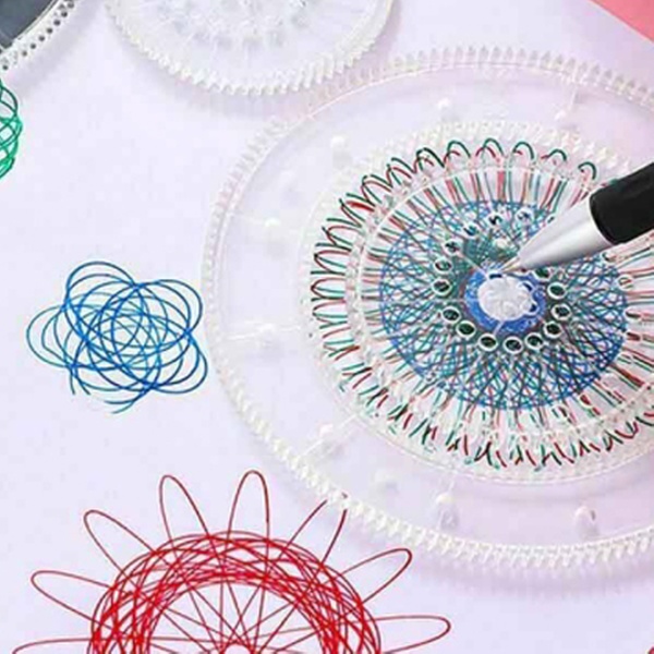 - Interlocking gears and wheels allow anyone to draw elegant, spiralling designs