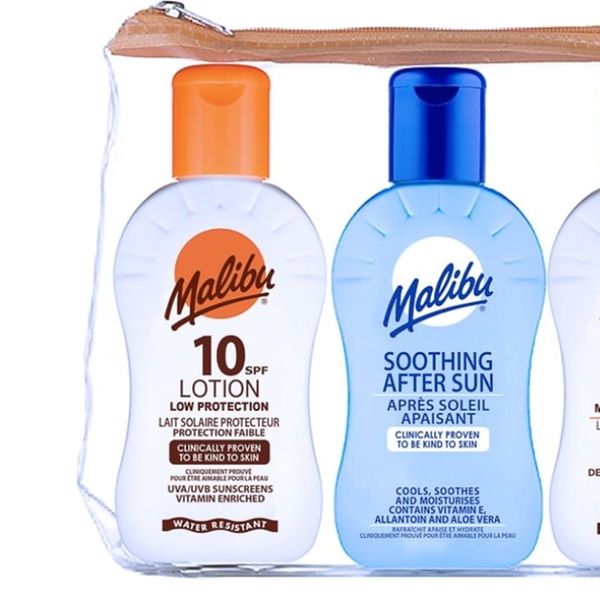 This Malibu 3-Pack Sun Travel Essentials Multipack includes three 100ml sun care products in a convenient travel bag, ideal for on-the-go protection and easy packing.