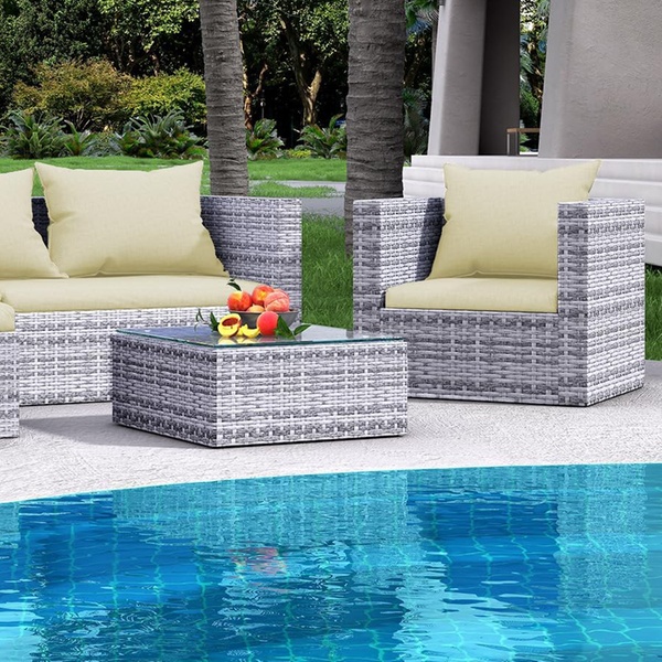 - This garden furniture set is finished with a high-grade premium PE rattan weave