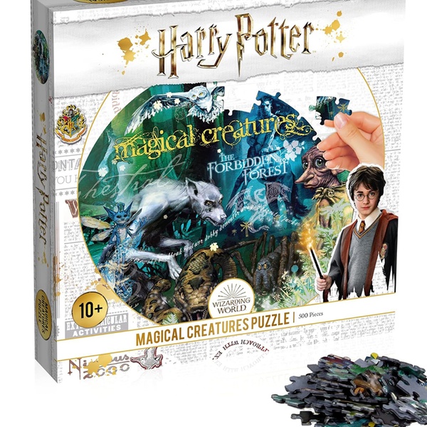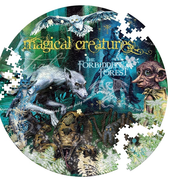 - 500-piece round jigsaw puzzle featuring magical creatures from the Wizarding World of Harry Potter