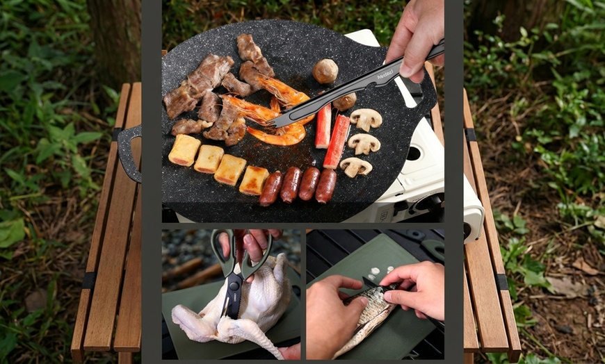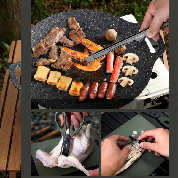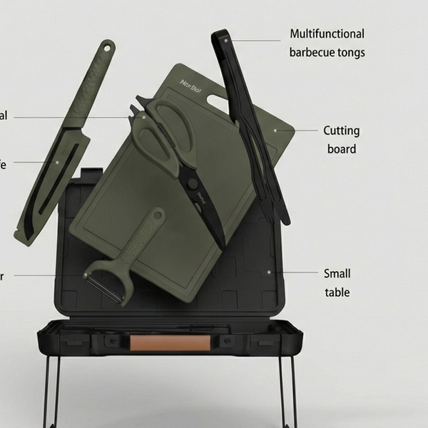 - Integrated 6-in-1 design includes knife, scissors, peeler, barbecue tongs, cutting board, and small table.