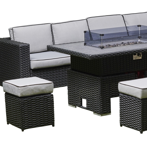 Designed for both comfort and versatility, this stylish rattan set features a rising dining firepit table, allowing one to seamlessly switch between a casual coffee table and a dining-height surface.