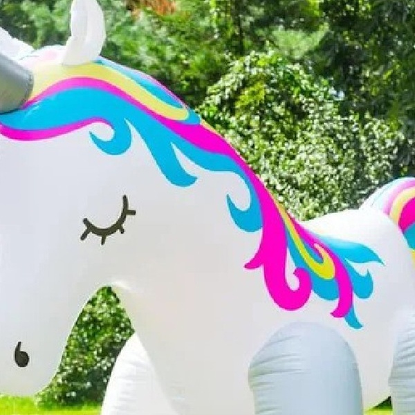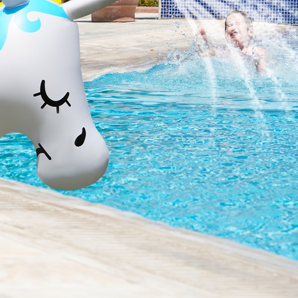 Featuring a fun design, this inflatable unicorn sprinkler sprays water from its horn, ensuring fun and laughter in the sun