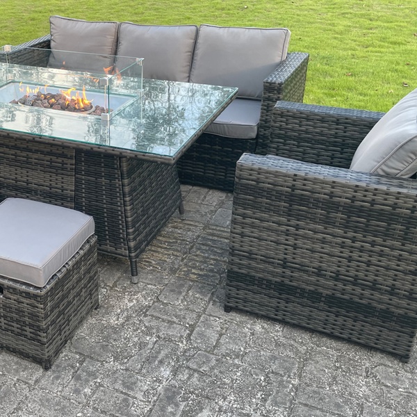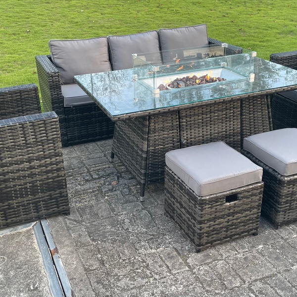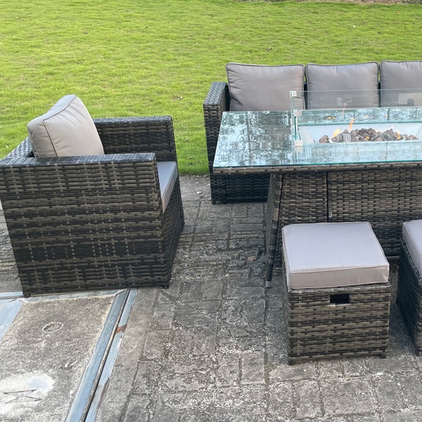 Transform your patio into a cosy retreat with this 7- seater rattan set, complete with cushions and an integrated gas fire pit table.