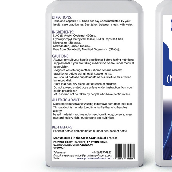 Ingredients: NAC (N-Acetyl-Cysteine) 600mg, HPMC Capsule Shell, Magnesium Stearate, Maltodextrin, Silicon Dioxide