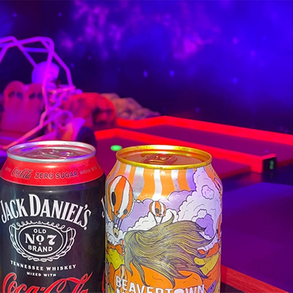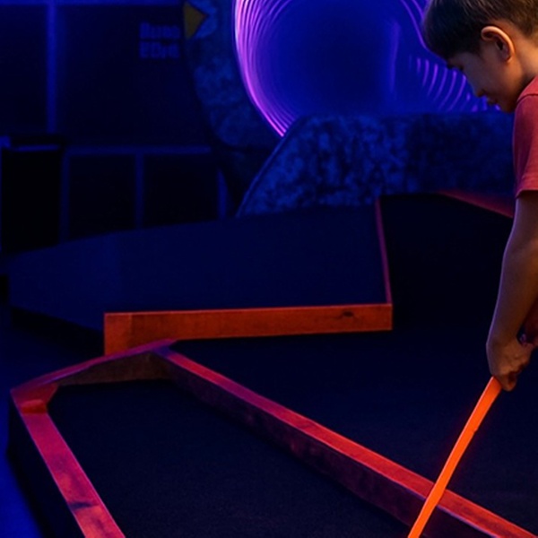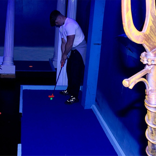 Enjoy an 18-hole neon adventure with dual themes; Atlantis Crusade & Space Odyssey plus food & drink options available!
