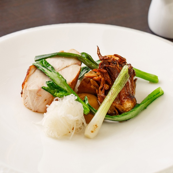 - Label Anglais chicken with hen of the woods, mooli and choy sum