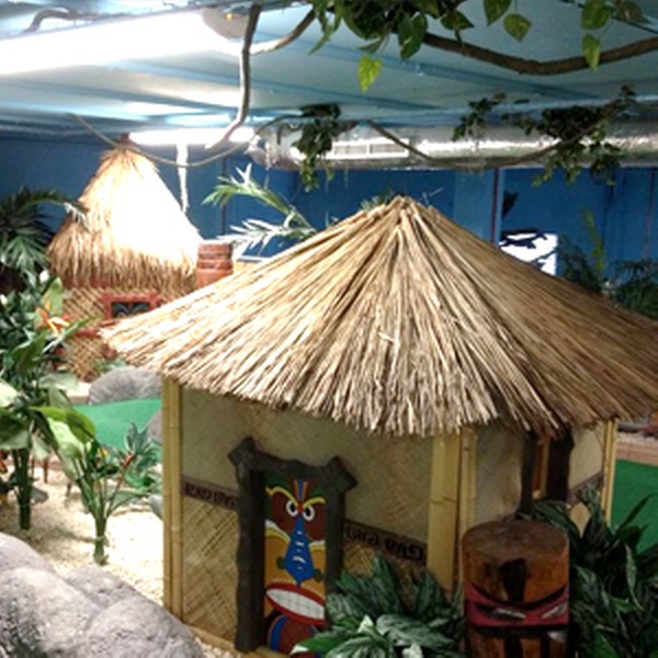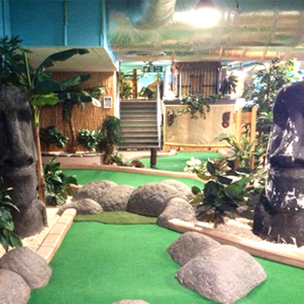 Adventure golfers can compete as a family or pairing at a choice of two tropical-style indoor courses. The hidden cove challenge takes players around the base of a dormant volcano, past waterfalls and palm trees and onto the secret lost settlers cave. The lost hut trail starts on a ridge above the other challenge and snakes through rock towers and miniature pacific island villages, before finishing at the highest point of the centre, with views over the whole island. Both courses feature a 19th-hole challenge, which guarantees the winner another free round.