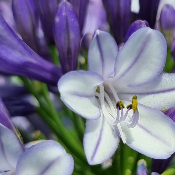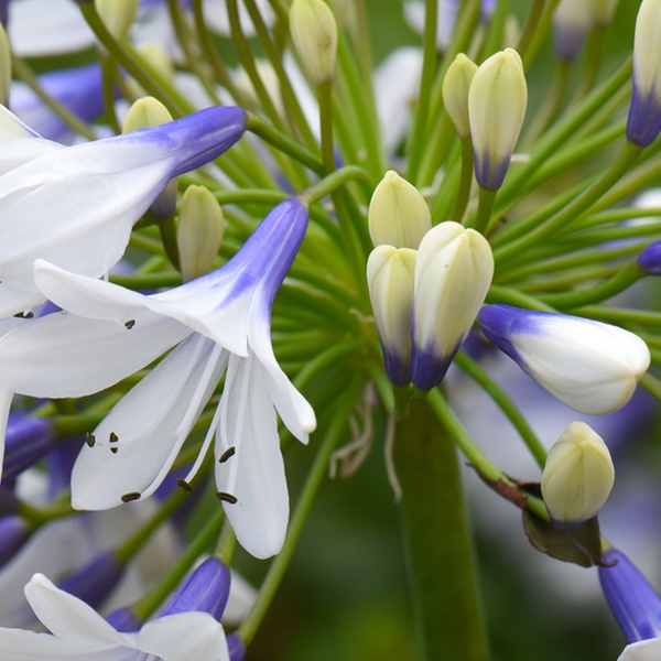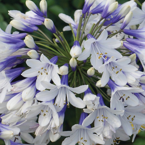 • Features dark blue buds that open to bluish-white flowers with blue stripes