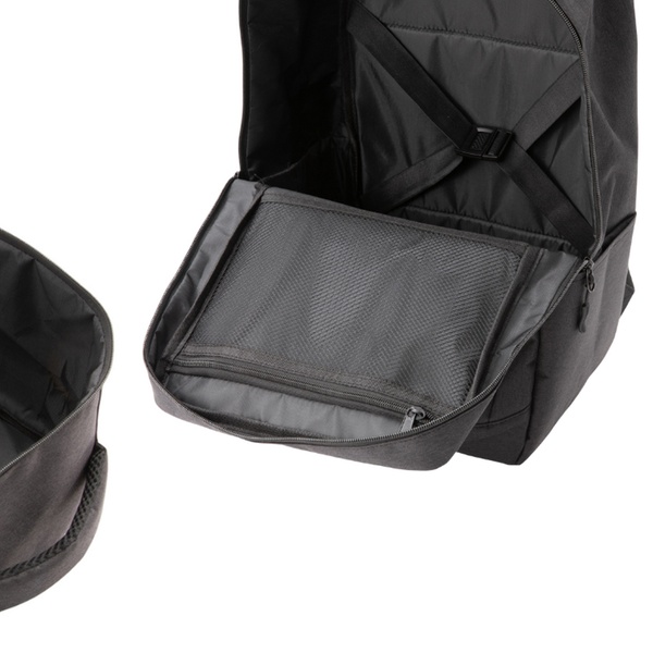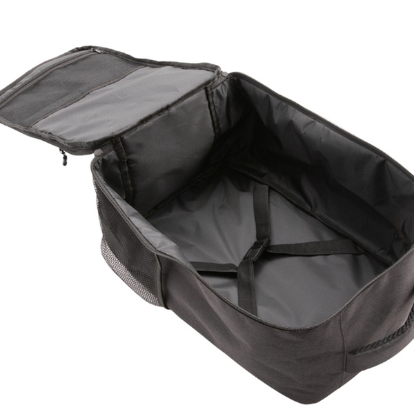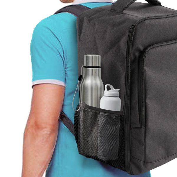 - Features a full zip opening for easy flat packing, an internal elastic belt, and two mesh side pockets.