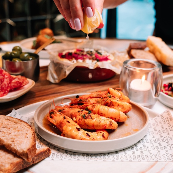 Feta baked with piquillo peppers, sourdough, hot honey & molasses-glazed chorizo, toasted focaccia, oil & balsamic and Nocellara olives.