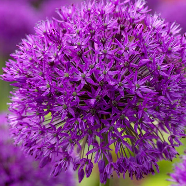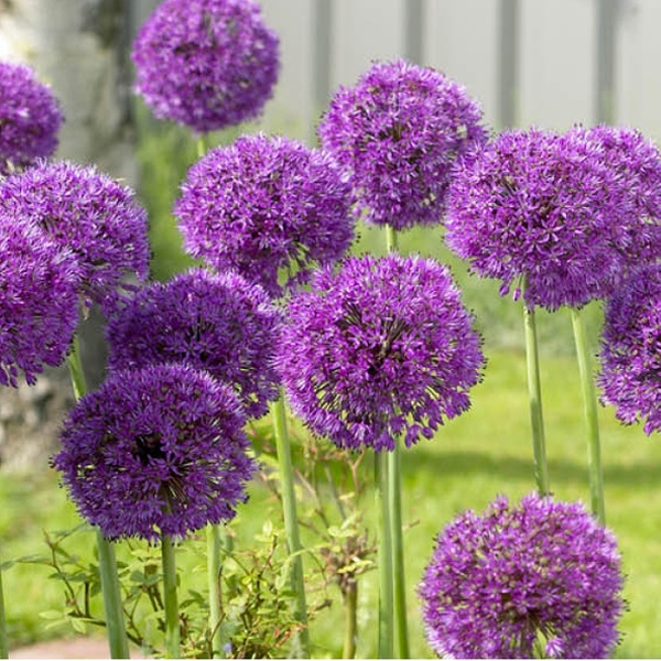 - Features large, spherical purple flower heads on slender stems.