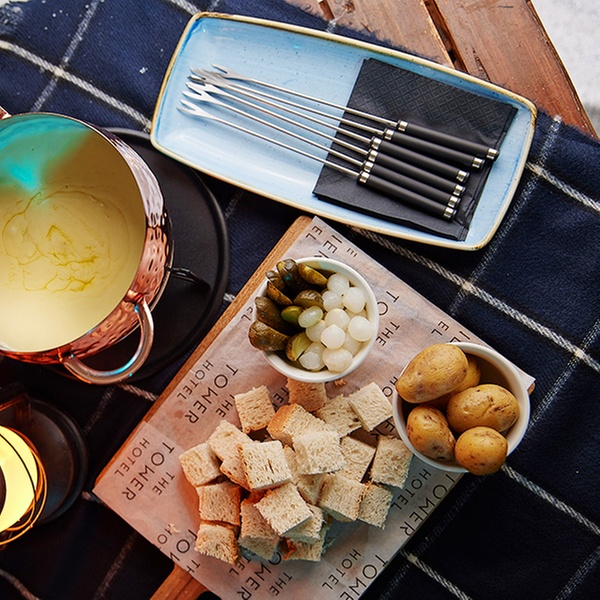 The Swiss fondue is the star of the show. Emmental and Gruyère cheeses, are melted with a hint of white wine, schnapps, and garlic. This is the recipe for that gooey, creamy dip you know well and will never want to stop enjoying! Paired with new potatoes, ciabatta, and pickled onions, this fondue takes sharing to a whole new level. Choose from options for two, three, four, or six — perfect for every size of gathering.