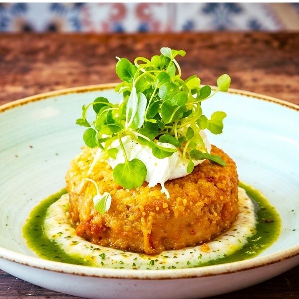 • Cod & Smoked Salmon Fishcake with Poached Egg, Baby Salad, and Pickled Shallot