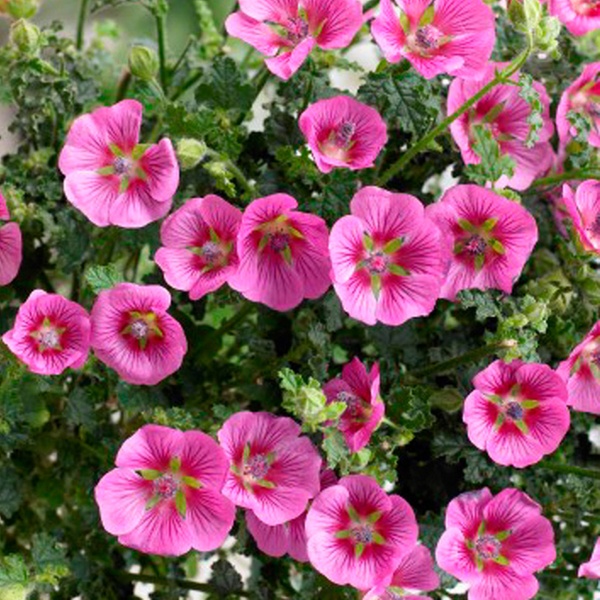 - Vibrant pink Hollyhock like flowers cover the green foliage through the summer months
