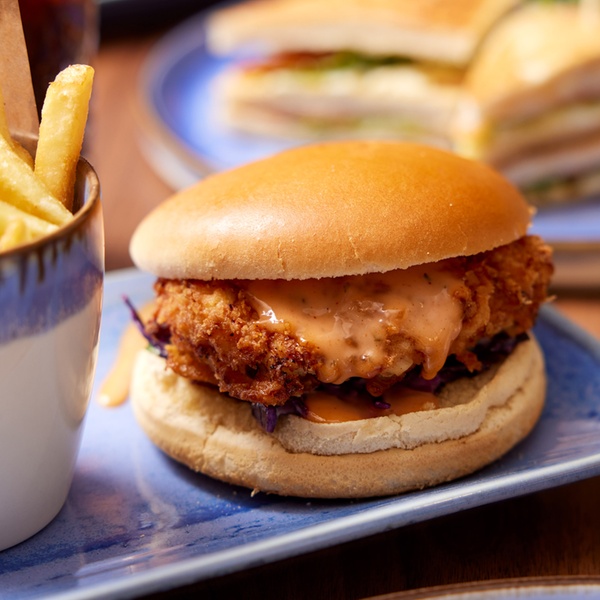 Crisp buttermilk fried chicken with red cabbage slaw, smothered in buffalo sauce and blue cheese sauce in our toasted brioche-style bun. Must Try.