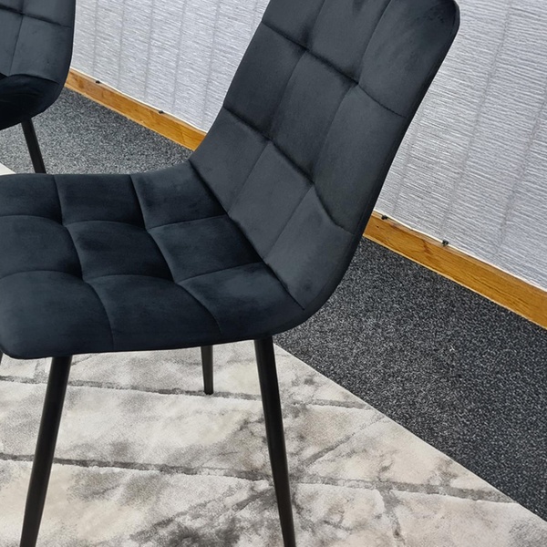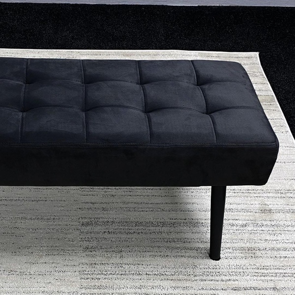 - The bench is padded and upholstered in soft black velvet with decorative tufting, offering additional seating with a modern and cosy flair.