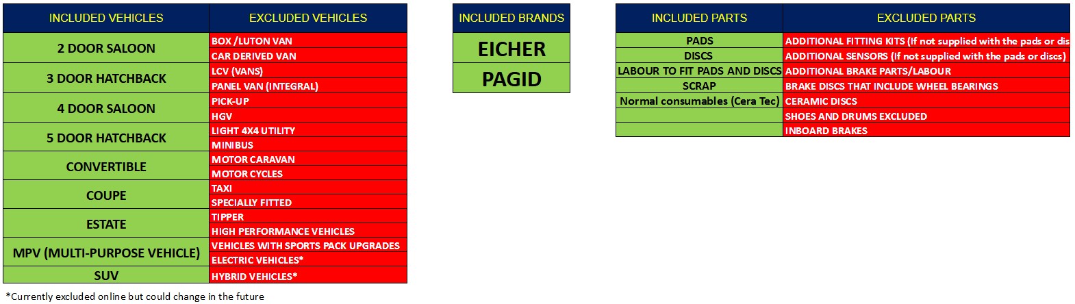 - The brake system will be fully inspected before any work is carried out, if there are any safety concerns with the system this will be highlighted to the customer before any work is carried out. When the brake pads and/or discs are changed they will be replaced with Pagid or Eicher brake parts. All other brands are excluded from the offer. The service doesn't include brake fluid change, brake wear sensors or brake fitting kits. If these items need changing they will be charged for separately.