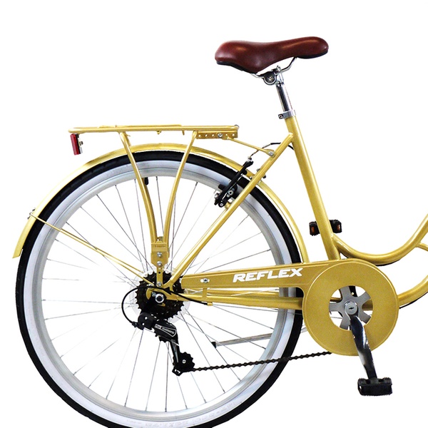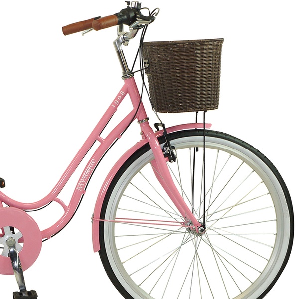 Featuring Shimano gears and 26” wheels, this low step-over frame bike has a front wicker-effect basket and rear carrier