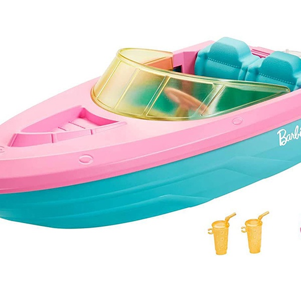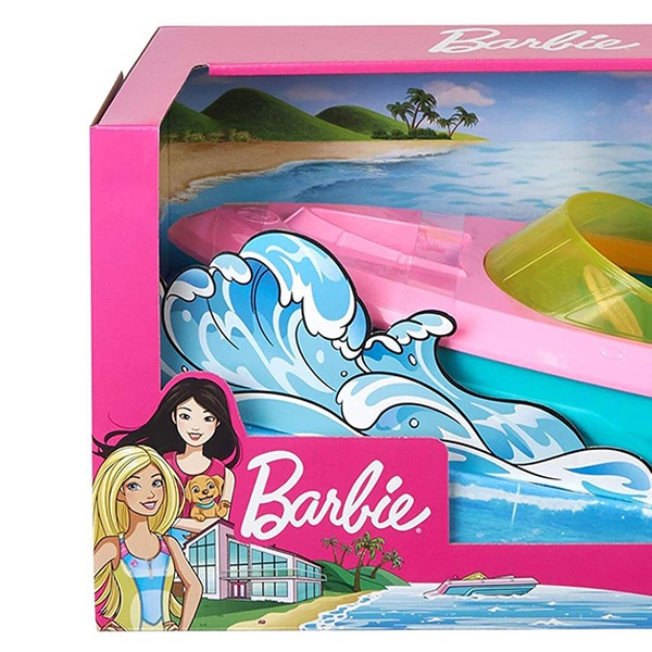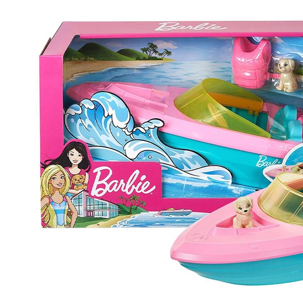 - Barbie doll’s pet puppy is along for the ride with a special seat on the bow