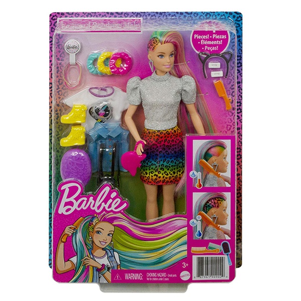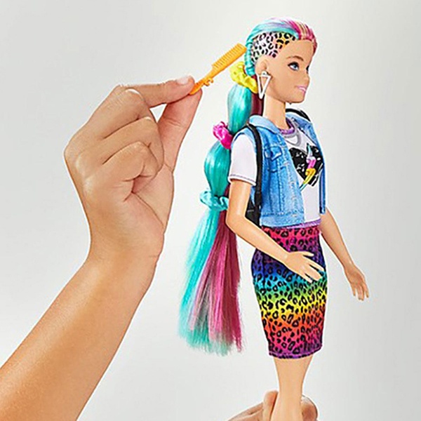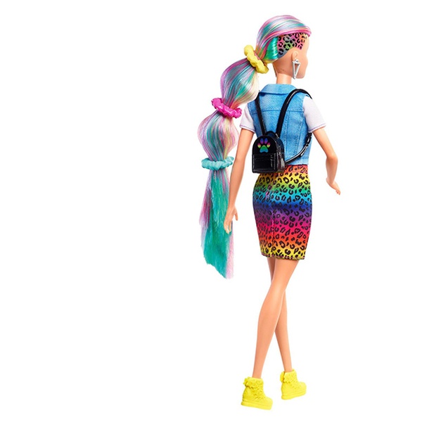 - Explore a variety of imaginative styles and looks with the Barbie Leopard Rainbow Hair doll (30.40cm)