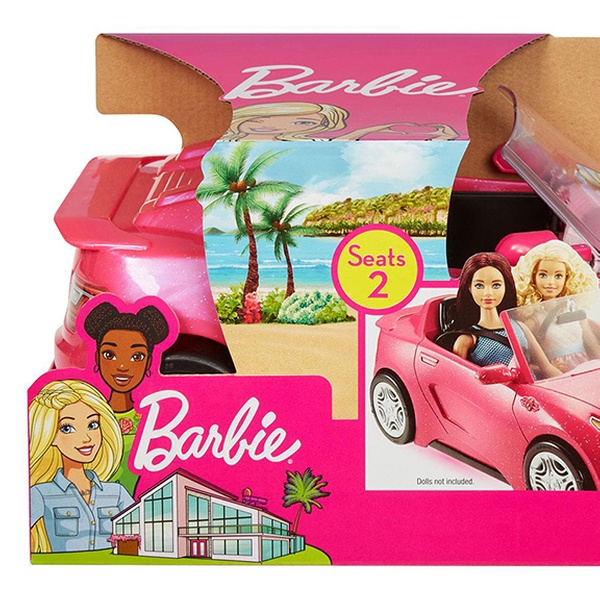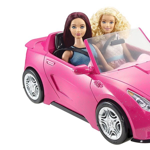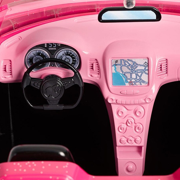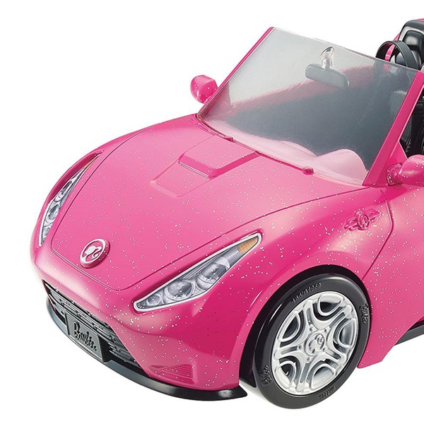 - Two-seater car is designed in sparkly pink with the Barbie silhouette as a hood ornament
