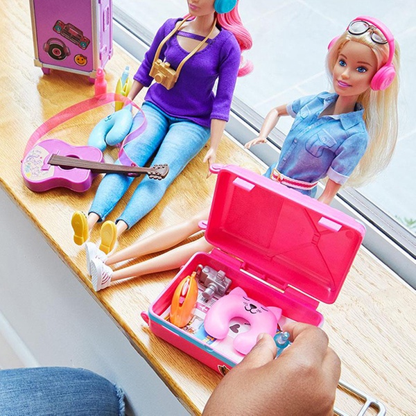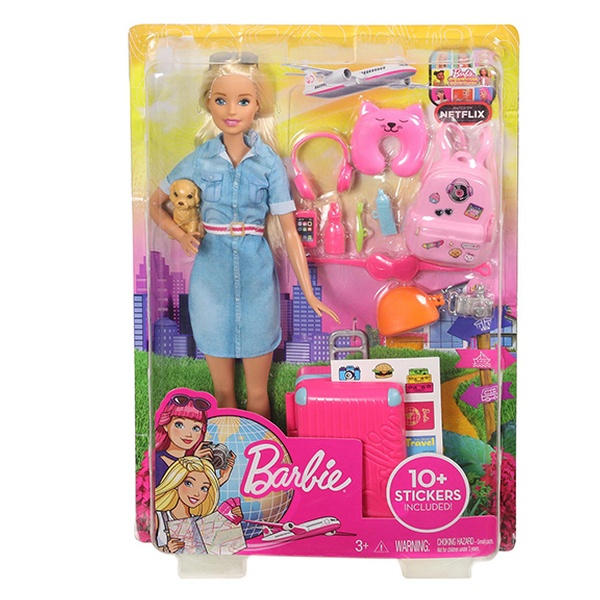 - Includes a Barbie doll wearing fashion and shoes, puppy and carrier, suitcase, backpack, sticker sheet and 10 travel-themed pieces; doll cannot stand alone; colours and decorations may vary