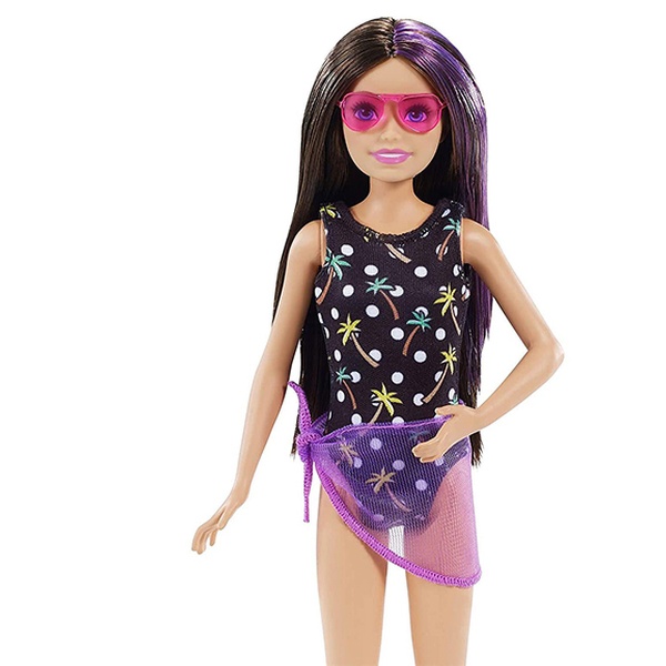 - Skipper babysitter doll wears a swimsuit with trendy tropical print, cover-up, and sunglasses