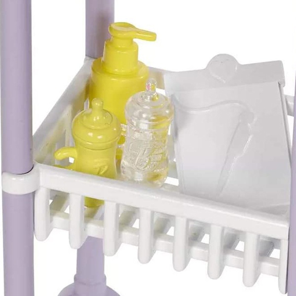 - Toy play items include an examination table with lotion bottles and other accessories, overhead mobile, and clear compartments for the two baby doll patients