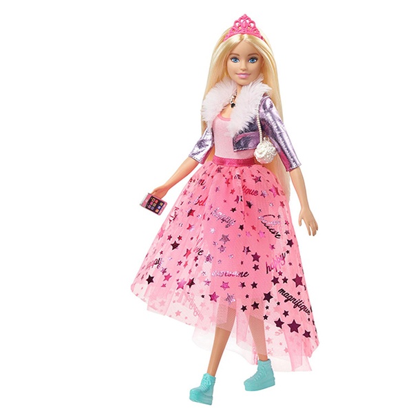 - Barbie doll comes dressed as a princess in a sparkly skirt, metallic jacket, and bright blue high-tops