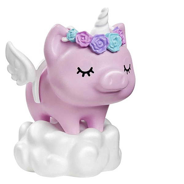 - Pet pig figure with a removable unicorn horn and wings, cloud bed and playful expression