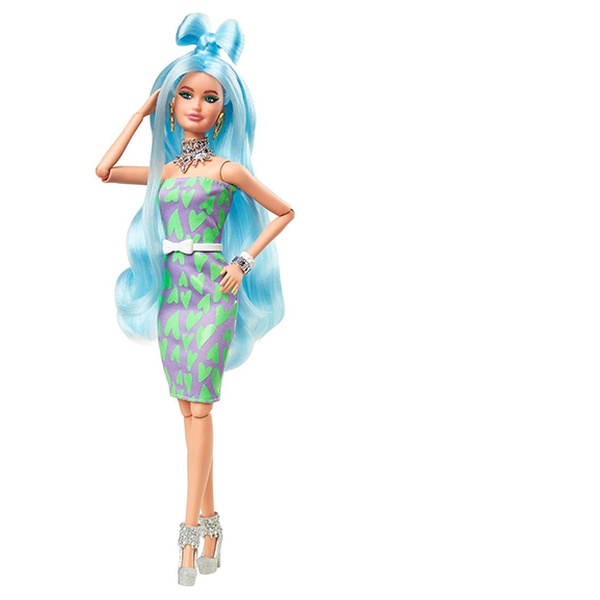 - 1 x Barbie doll with 8.5" shimmery pink and purple hair