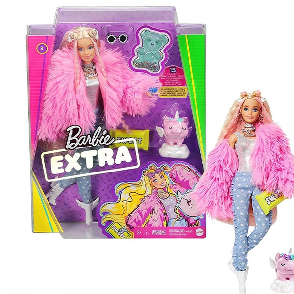 Barbie Extra Doll in Pink Fluffy Coat with Pet Unicorn Pig
