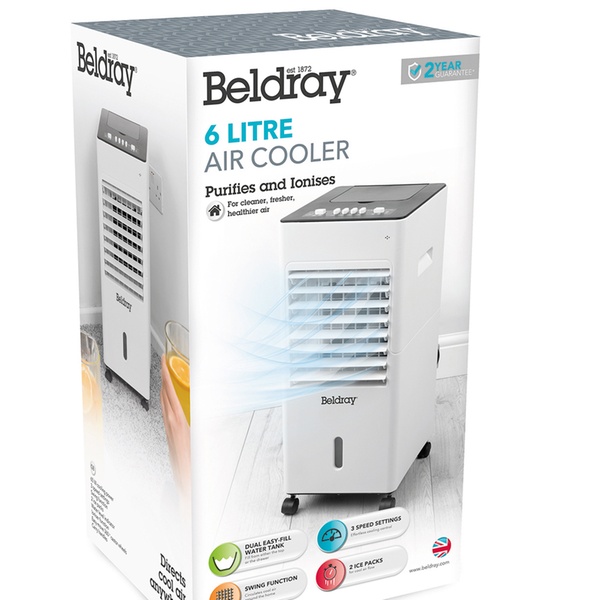 Ideal to provide some much-needed relief on hot days, this adjustable air cooler features a capacious 6L tank and an ionising function
