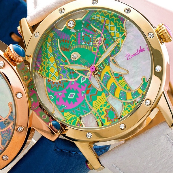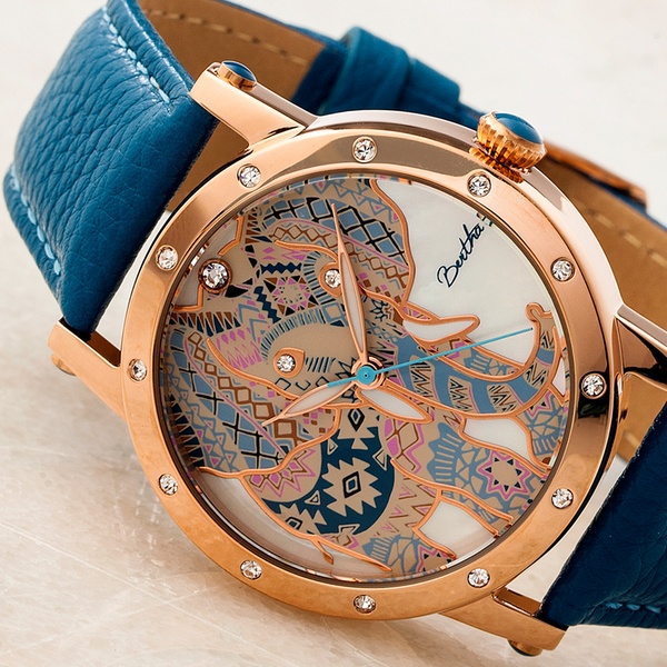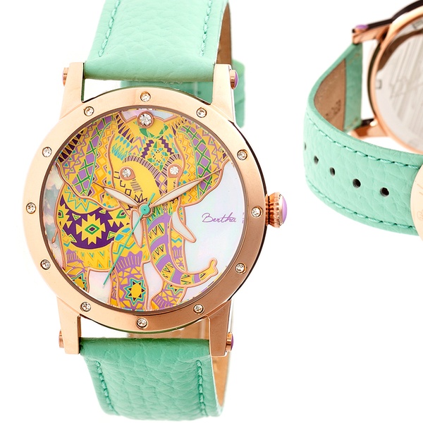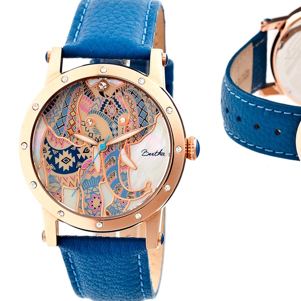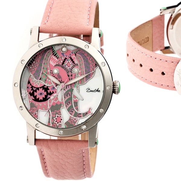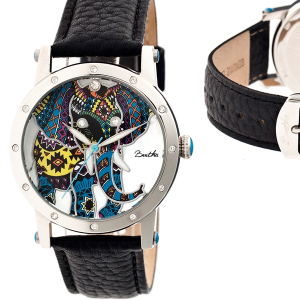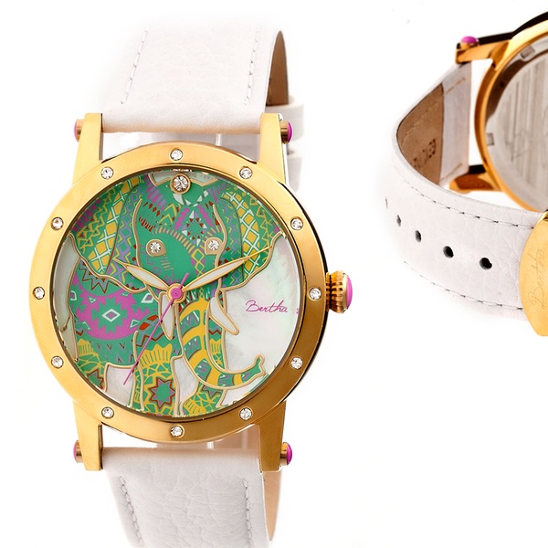 Adorned with 12 crystal markers, this chic leather-band watch features a mother-of-pearl dial and stainless steel case