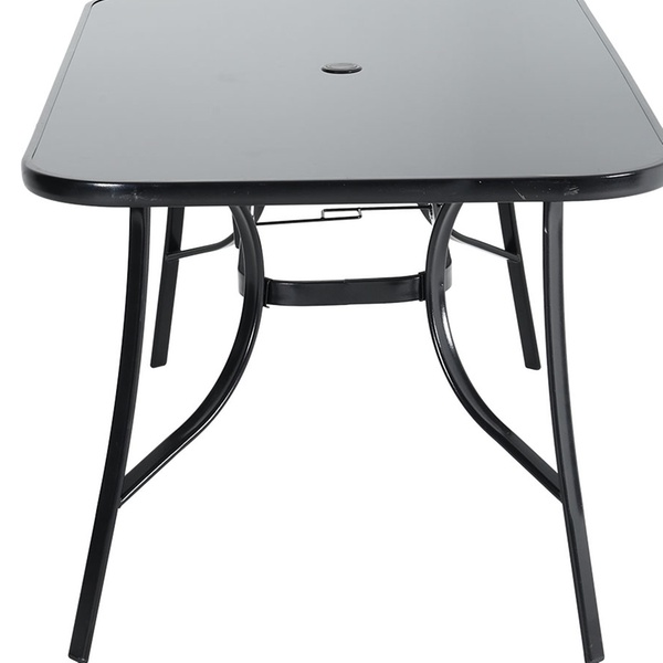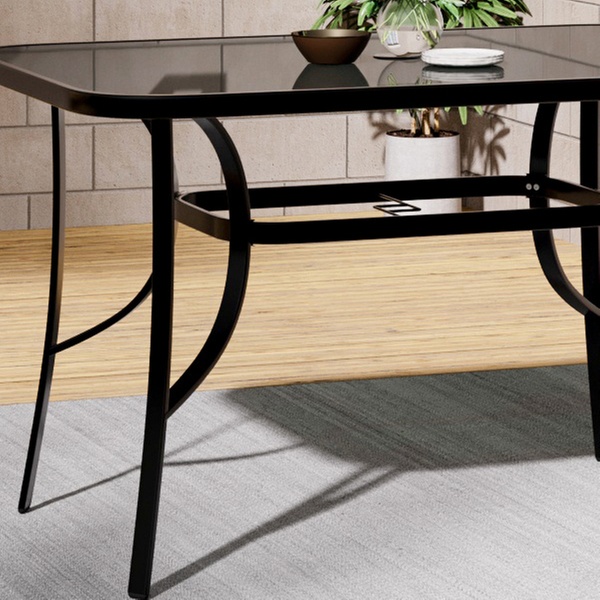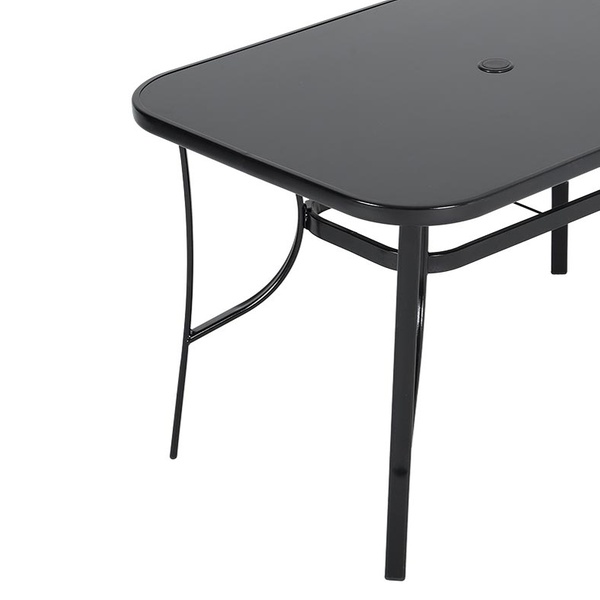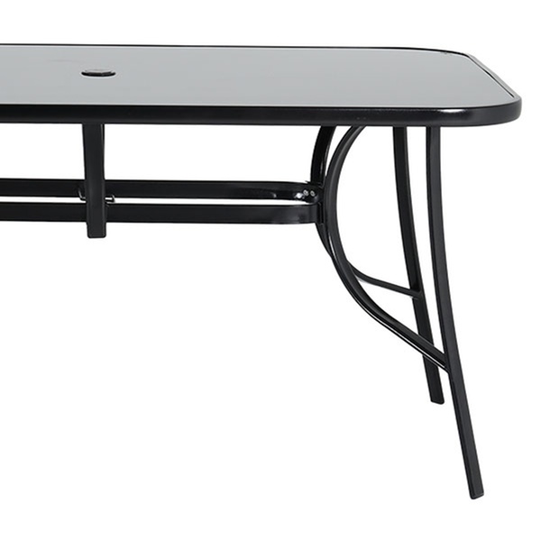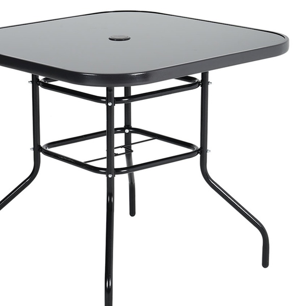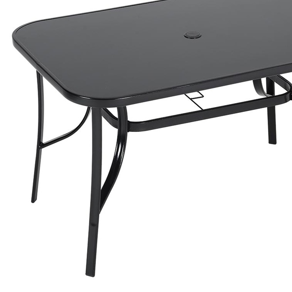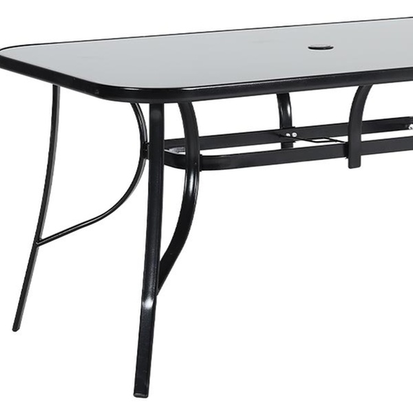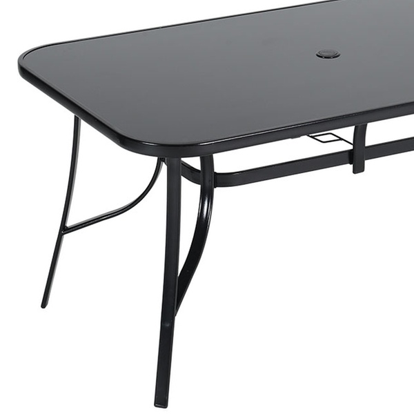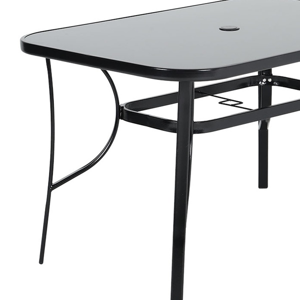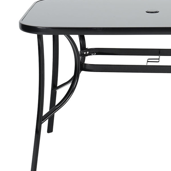 Boost outdoor vibes with a sleek black tempered glass tabletop, featuring a convenient umbrella hole for sunny days