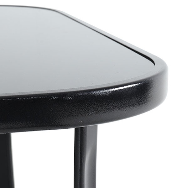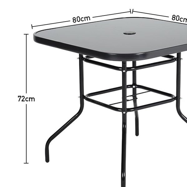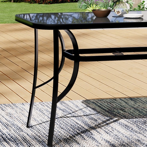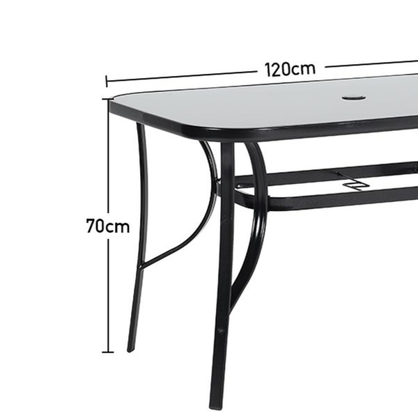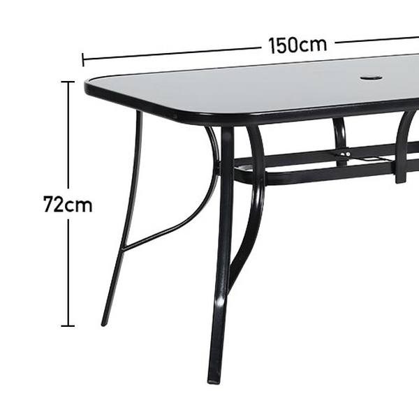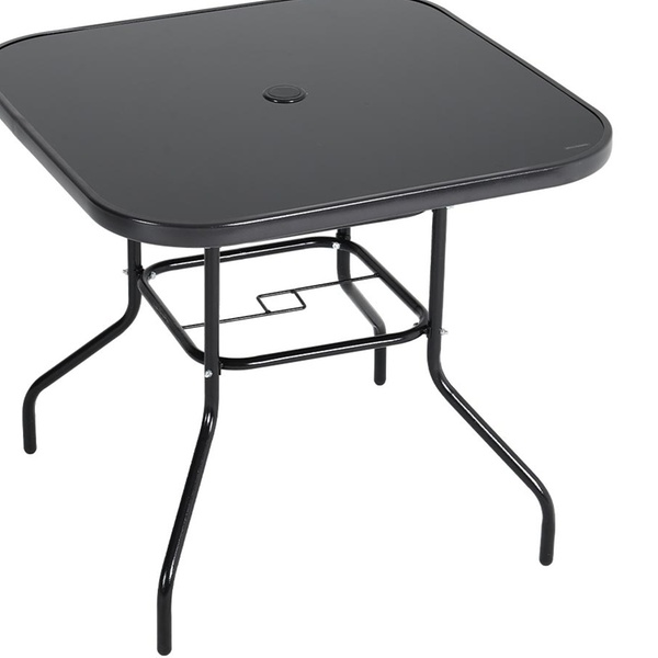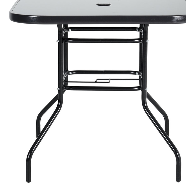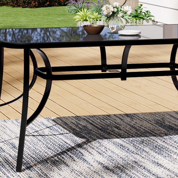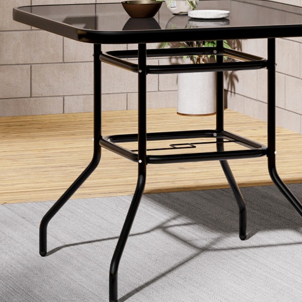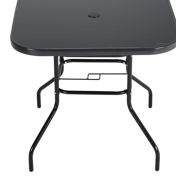 Boost outdoor vibes with a sleek black tempered glass tabletop, featuring a convenient umbrella hole for sunny days