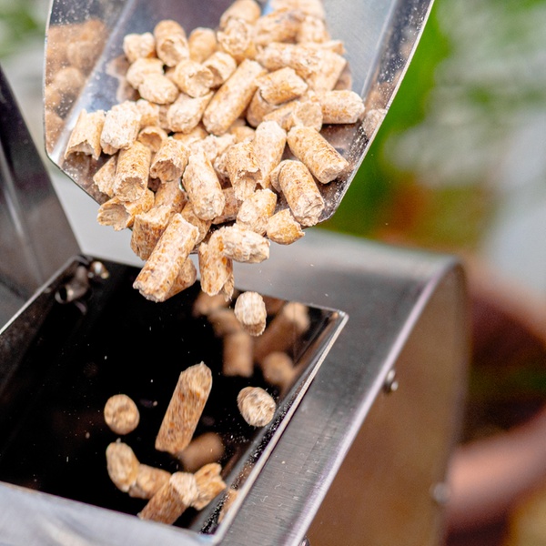 - Fueled by wood pellets (not included) which are easily added through a handy little slot at the rear of the oven