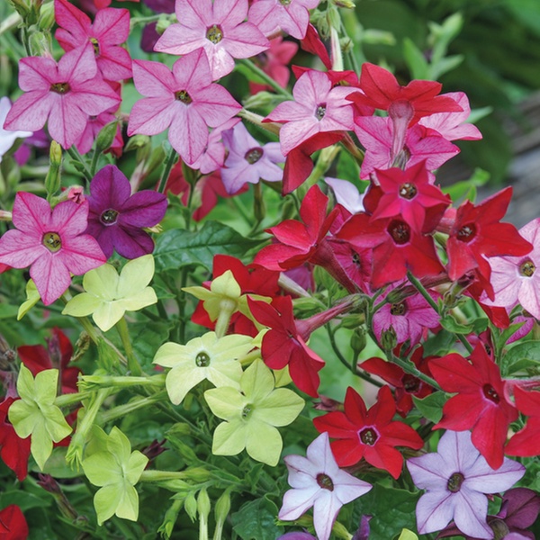 - Nicotiana 'Eau de Cologne Mixed': uniform, mid-height plants with upward-facing flowers, in a tapestry of glowing colours
