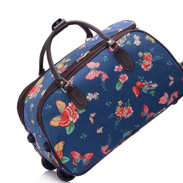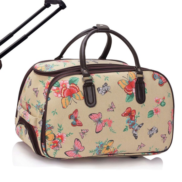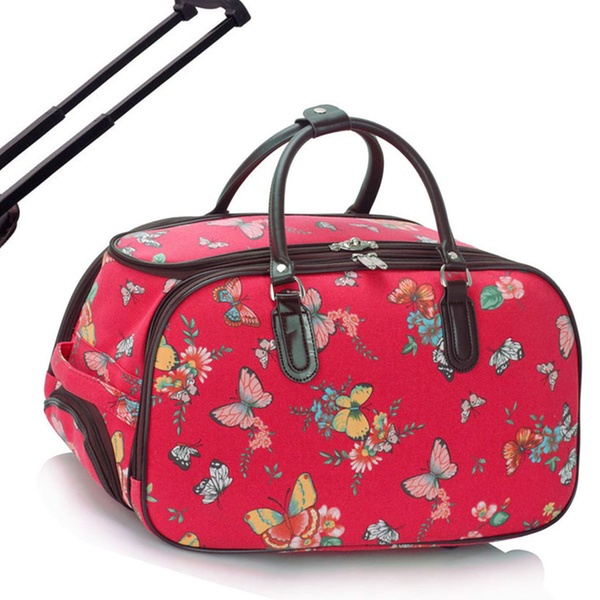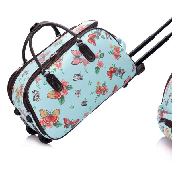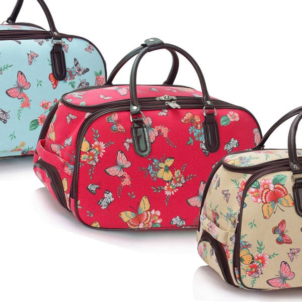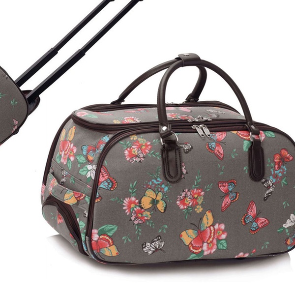 With sporting twin top handles, zipper closure and butterfly print this wheeled holdall bag is designed to make traveling a breeze