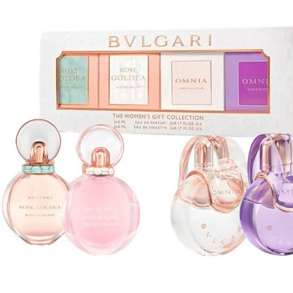 The Bvlgari Women’s Miniature Coffret Set offers a luxurious selection of four 5ml fragrances -Rose Goldea Blossom Delight EDP, Rose Goldea Blossom Delight EDT, Omnia Crystalline EDT, and Omnia Amethyste EDT.