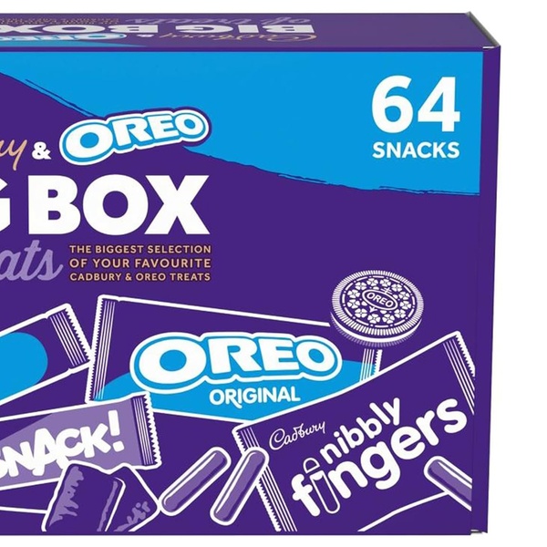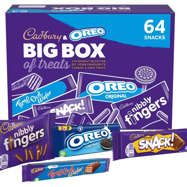 Satisfy all the cravings with the Cadbury & Oreo Big Box of Treats; this selection box contains 64 individual treats of your Cadbury favourites, including Nibbly Fingers, Oreo, Time Out Wafer, and Snack